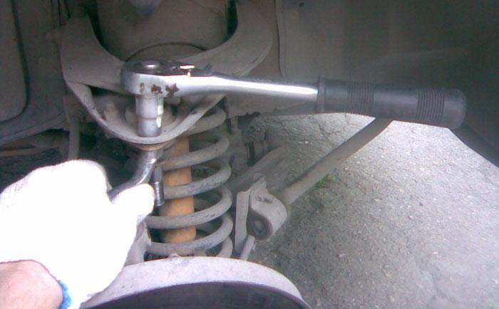 Затем берем ключик рожковый на 22 и приступаем к процессу откручивания гаек, которые держат пальцы наших шаровых опор. Как видно на фото ниже, я подогнал высоту домкрата так, чтобы ключ проходил между витками пружины, так гораздо удобнее и быстрее